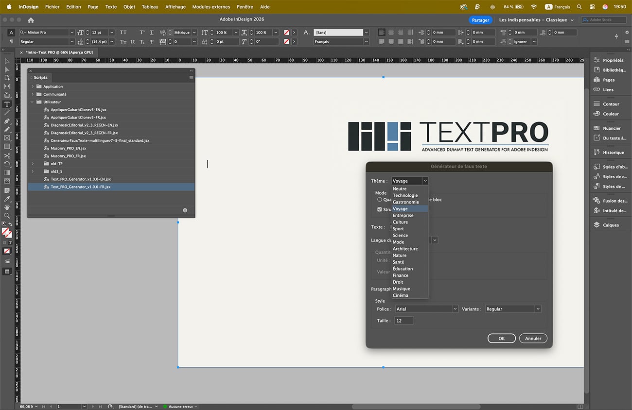 Text PRO est un script professionnel, disponible en anglais et en français, pour Adobe InDesign conçu pour générer des contenus factices crédibles, structurés et exploitables, au service de la mise en page, et non l’inverse.
